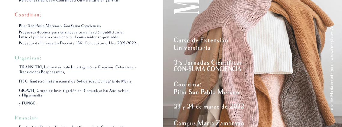 Se celebraron el 23 y 24 de marzo de 2022, en el Campus María Zambrano para tratar las implicaciones de la industria de la moda, el consumo y la sostenibilidad. Se celebraron talleres con profesionales del entorno que vienen practicando un modelo ecosostenible.